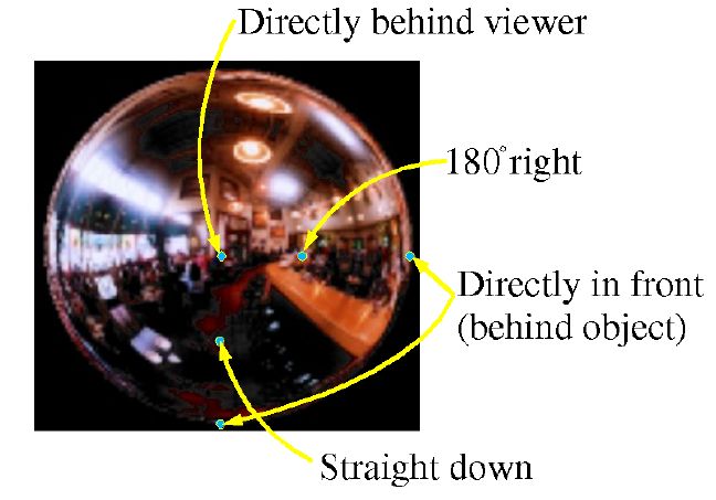 A sphere-mapped texture coordinate is computed by taking the vector from the viewpoint (the eye), and reflecting it about the surface's normal vector. The resulting direction is then used to look up a point in the texture. The texture image is assumed to be warped to provide a 360 degree view of the environment being reflected.